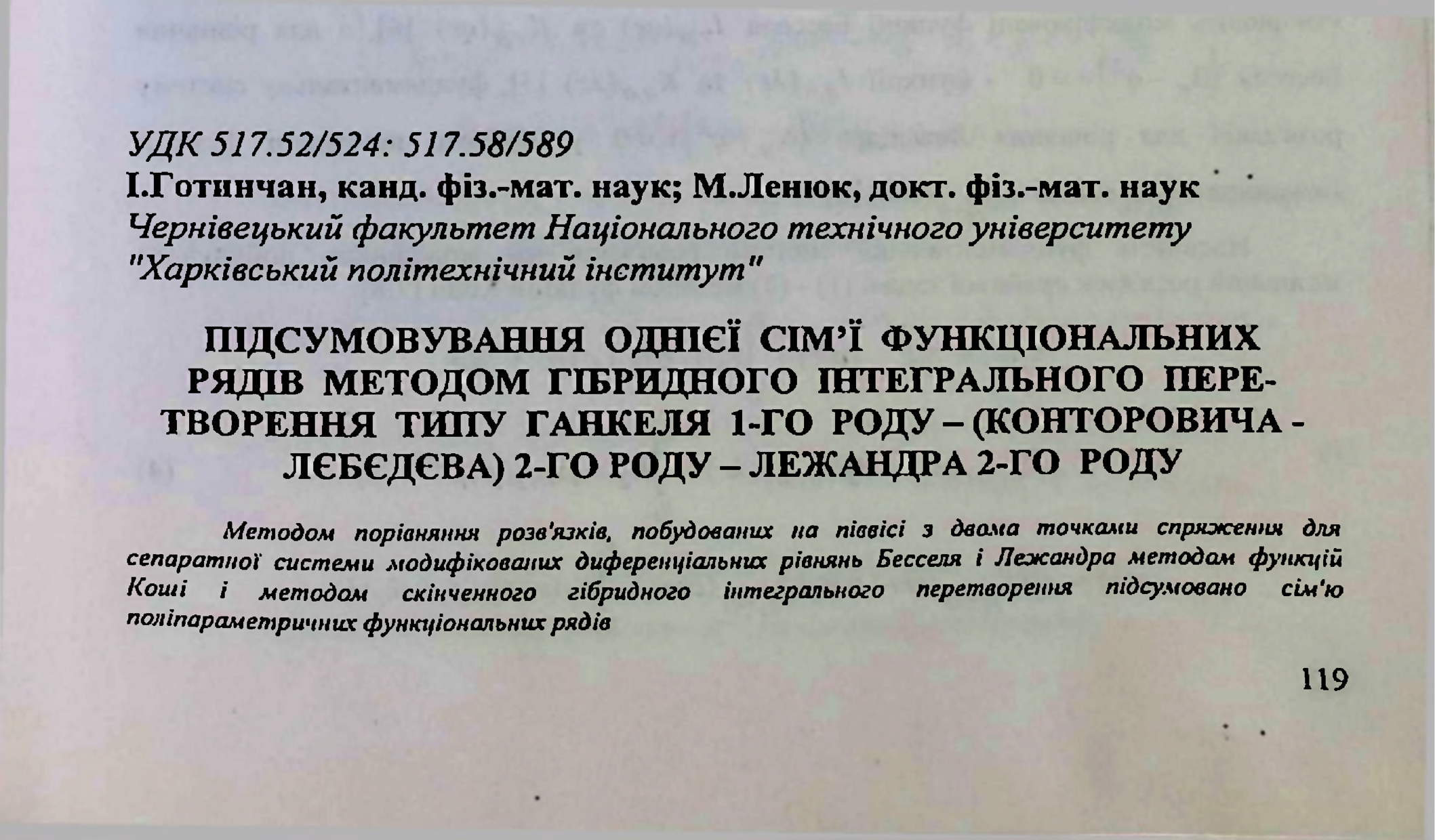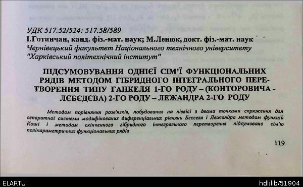 | Bibliographic reference (2015): | Готинчан І., Ленюк М. П. Підсумовування однієї сім’ї функціональних рядів методом гібридного інтегрального пере творення типу Ганкеля 1-го роду - (Конторовича-Лєбєдєва) 2-го роду - Лежандра 2-го роду // Вісник ТДТУ, Тернопіль. 2003. Том 8. № 4. С. 119–127. |