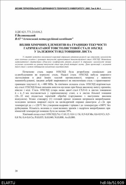 | Bibliographic reference (2015): | Великоцький Р. Вплив хімічних елементів на границю текучості гарячекатаної товстолистової сталі 10ХСНД у залежності від товщини листа // Вісник ТДТУ, Тернопіль. 2003. Том 8. № 4. С. 20–27. |