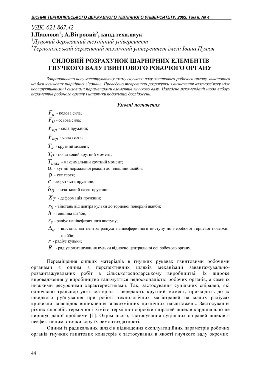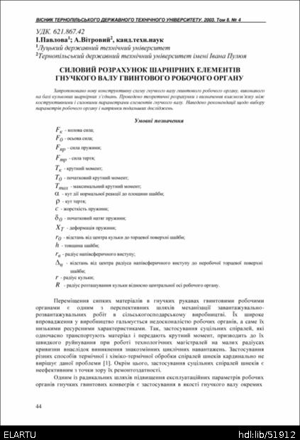 | Bibliographic citation (APA): | Pavlova, I., & Vitroviy, A. (2003). Sylovyi rozrakhunok sharnirnykh elementiv hnuchkoho valu hvyntovoho robochoho orhanu [Paver calculation of joint elements of the screw working part flexible shaft]. Scientific Journal of the Ternopil State Technical University, 8(4), 44-49. TSTU. [in Ukrainian]. |