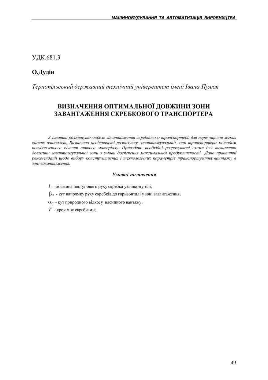 | Bibliographic citation (APA): | Dudin, O. (2003). Vyznachennia optymalnoi dovzhyny zony zavantazhennia skrebkovoho transportera [Definition of optimum length for the zone of loading of the scraper conveyor]. Scientific Journal of the Ternopil State Technical University, 8(4), 49-56. TSTU. [in Ukrainian]. |