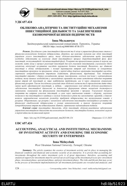 | Bibliographic citation (APA): | Melnychuk, I. (2025). Oblikovo-analitychni ta instytutsiini mekhanizmy investytsiinoi diialnosti ta zabezpechennia ekonomichnoi bezpeky pidpryiemstv [Accounting, analytical and institutional mechanisms of investment activity and ensuring the economic security of enterprises]. Galician economic journal, 97(6), 124-135. TNTU. [in Ukrainian]. |