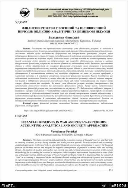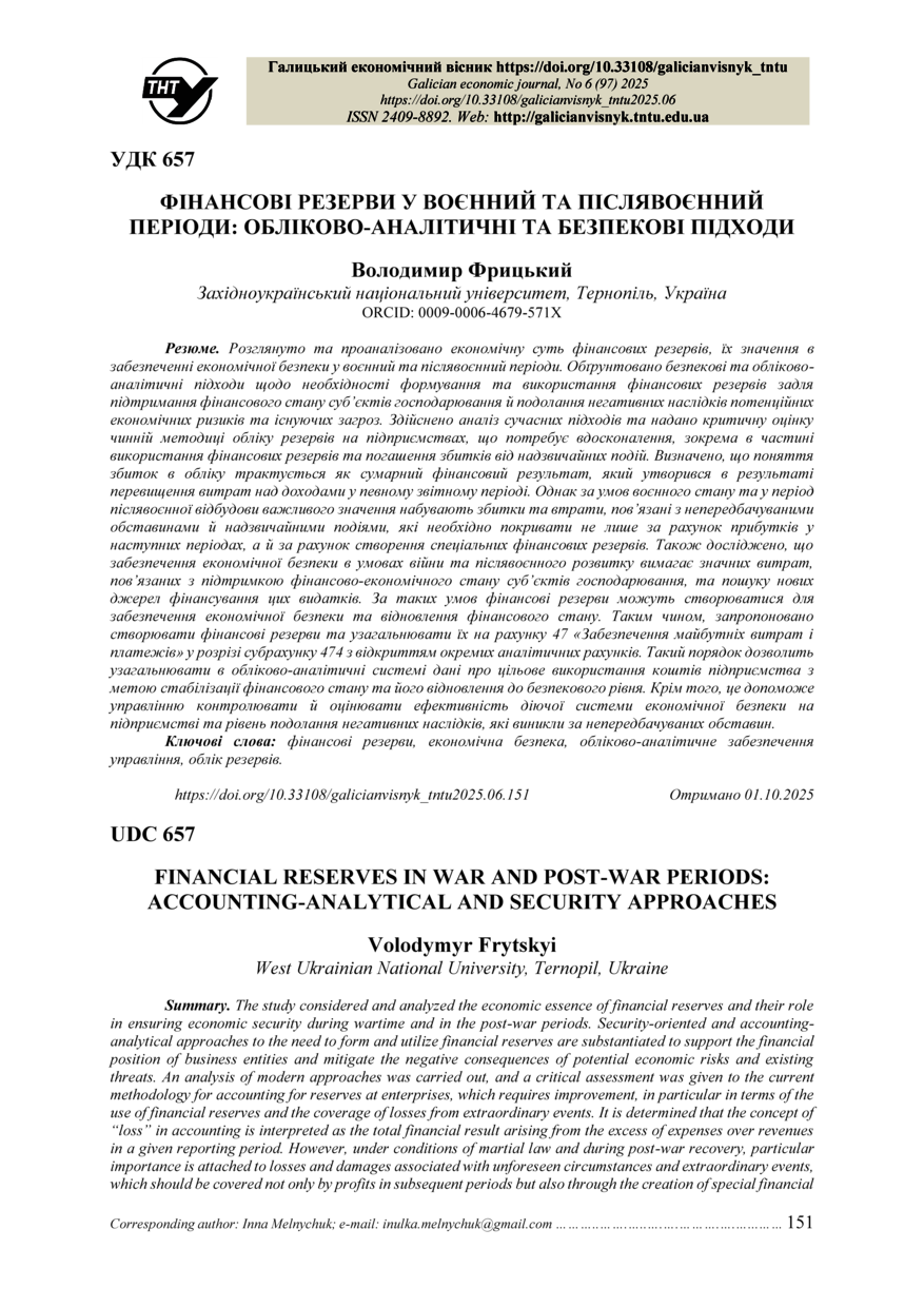 | Bibliographic citation (APA): | Frytskyi, V. (2025). Finansovi rezervy u voiennyi ta pisliavoiennyi periody: oblikovo-analitychni ta bezpekovi pidkhody [Financial reserves in war and post-war periods: accounting-analytical and security approaches]. Galician economic journal, 97(6), 151-160. TNTU. [in Ukrainian]. |