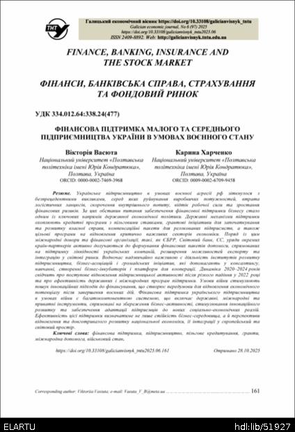 | Bibliographic citation (APA): | Vasiuta, V., & Kharchenko, K. (2025). Finansy, bankivska sprava, strakhuvannia ta fondovyi rynok [Financial support for small and medium-sized entrepreneurship in Ukraine martial law conditions]. Galician economic journal, 97(6), 161-168. TNTU. [in Ukrainian]. |