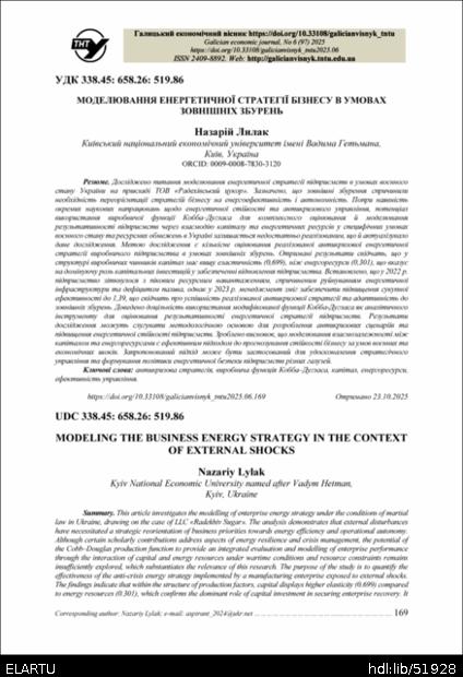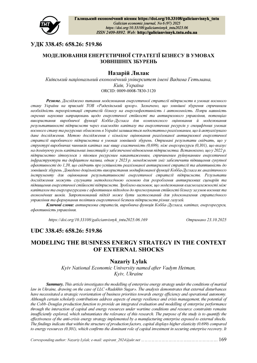 | Bibliographic citation (APA): | Lylak, N. (2025). Modeliuvannia enerhetychnoi stratehii biznesu v umovakh zovnishnikh zburen [Modeling the business energy strategy in the context of external shocks]. Galician economic journal, 97(6), 169-175. TNTU. [in Ukrainian]. |