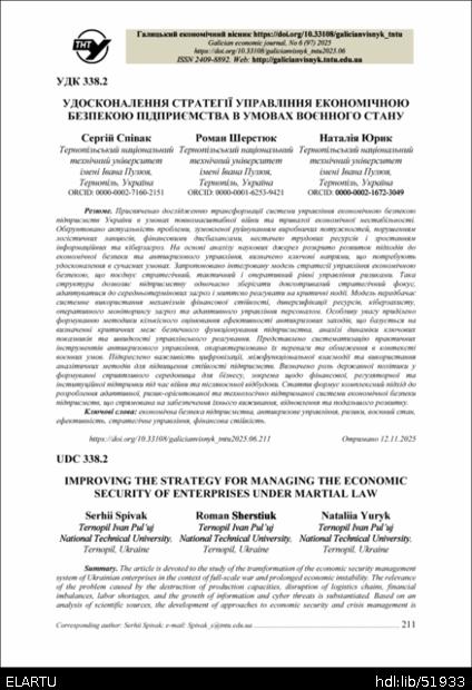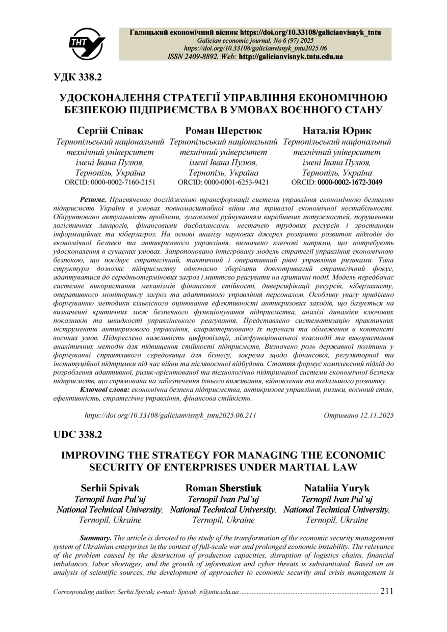 | Bibliographic citation (APA): | Spivak, S., Sherstiuk, R., & Yuryk, N. (2025). Udoskonalennia stratehii upravlinnia ekonomichnoiu bezpekoiu pidpryiemstva v umovakh voiennoho stanu [Improving the strategy for managing the economic security of enterprises under martial law]. Galician economic journal, 97(6), 211-217. TNTU. [in Ukrainian]. |