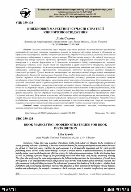 | Bibliographic citation (APA): | Syrota, L. (2025). Knyzhkovyi marketynh: suchasni stratehii knyhorozpovsiudzhennia [Book marketing: modern strategies for book distribution]. Galician economic journal, 97(6), 238-245. TNTU. [in Ukrainian]. |