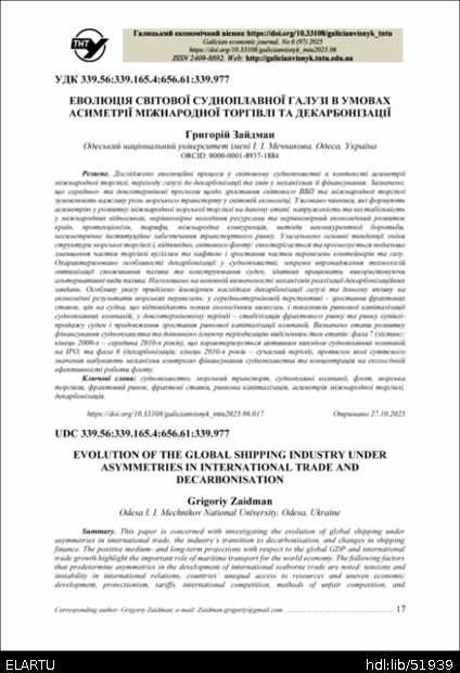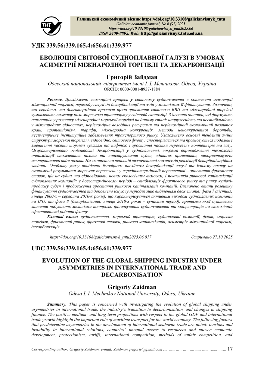 | Bibliographic citation (APA): | Zaidman, G. (2025). Evoliutsiia svitovoi sudnoplavnoi haluzi v umovakh asymetrii mizhnarodnoi torhivli ta dekarbonizatsii [Evolution of the global shipping industry under asymmetries in international trade and decarbonisation]. Galician economic journal, 97(6), 17-28. TNTU. [in Ukrainian]. |