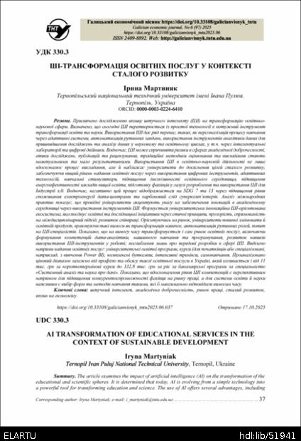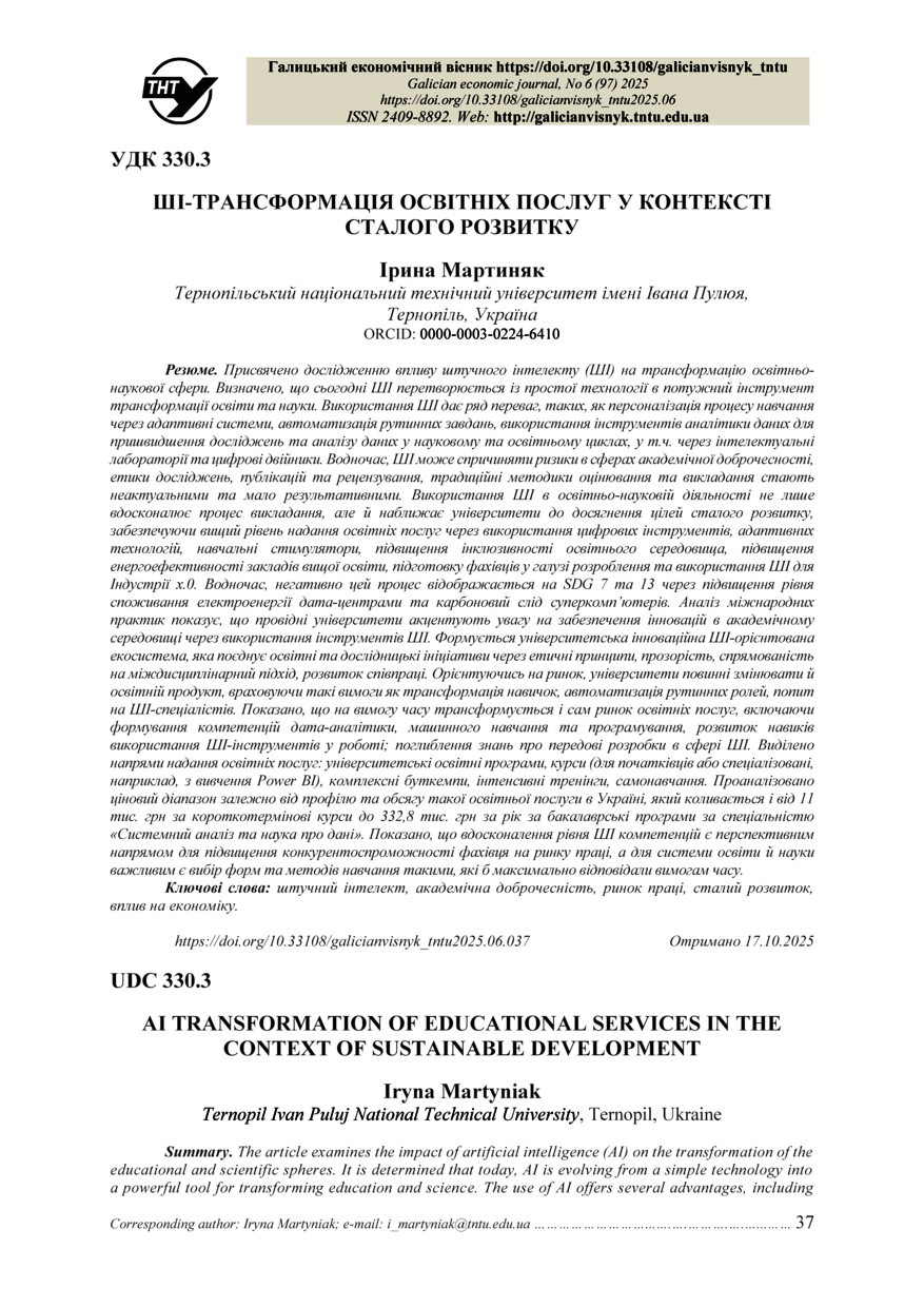 Bibliographic citation (APA): Martyniak, I. (2025). Shi-transformatsiia osvitnikh posluh u konteksti staloho rozvytku [Ai transformation of educational services in the context of sustainable development]. Galician economic journal, 97(6), 37-45. TNTU. [in Ukrainian].