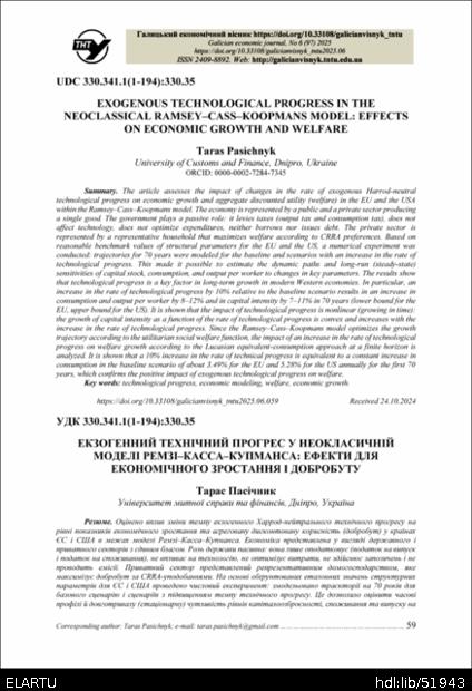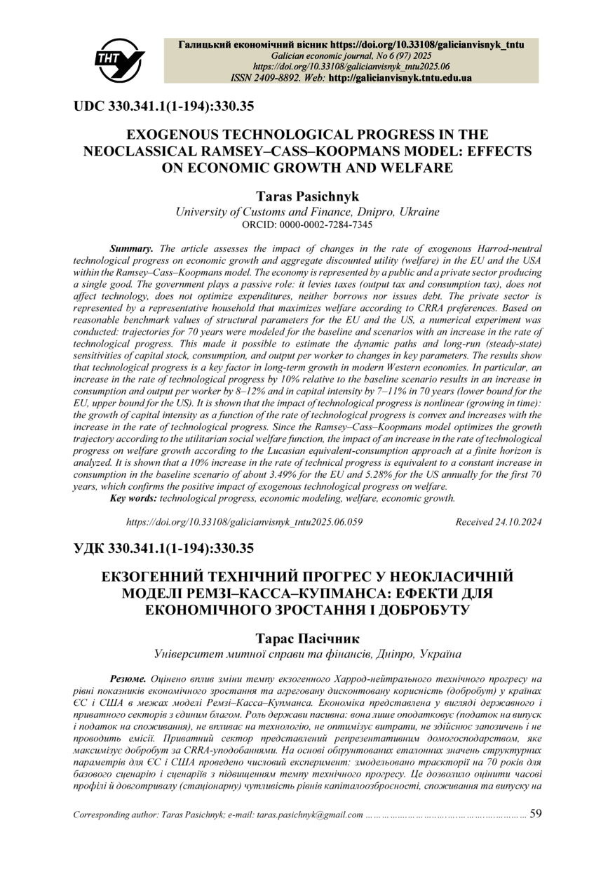 | Bibliographic citation (APA): | Pasichnyk, T. (2025). Ekzohennyi tekhnichnyi prohres u neoklasychnii modeli Remzi–Kassa–Kupmansa: efekty dlia ekonomichnoho zrostannia i dobrobutu [Exogenous technological progress in the neoclassical Ramsey–Cass–Koopmans model: effects on economic growth and welfare]. Galician economic journal, 97(6), 59-73. TNTU. [in Ukrainian]. |