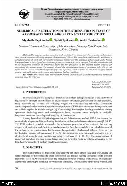 | Bibliographic citation (APA): | Prykhodko, M., Pyskunov, S., & Trubachev, S. (2025). Numerical calculation of the stress-strain state of a composite shell aircraft nacelle structure. Scientific Journal of the Ternopil National Technical University, 120(4), 70-77. TNTU.. |