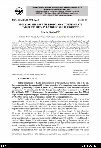| Bibliographic citation (APA): | Stadnyk, M. (2025). Applying the safe methodology to integrate cybersecurity in large-scale IT projects. Scientific Journal of the Ternopil National Technical University, 120(4), 99-109. TNTU.. |