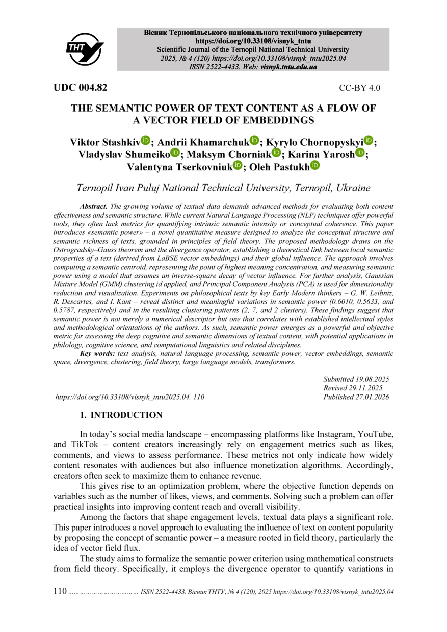 | Bibliographic citation (APA): | Stashkiv, V., Khamarchuk, A., Chornopyskyi, K., Shumeiko, V., Chorniak, M., & Yarosh, K. (2025). The semantic power of text content as a flow of a vector field of embeddings. Scientific Journal of the Ternopil National Technical University, 120(4), 110-119. TNTU.. |