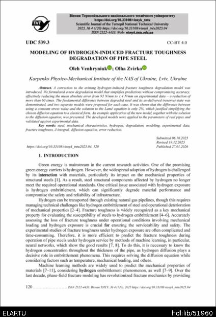 | Bibliographic citation (APA): | Venhryniuk, O., & Zvirko, O. (2025). Modeling of hydrogen-induced fracture toughness degradation of pipe steel. Scientific Journal of the Ternopil National Technical University, 120(4), 120-129. TNTU.. |