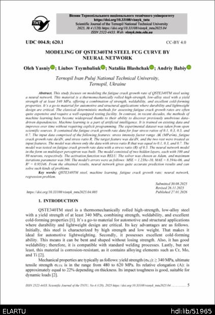 | Bibliographic citation (APA): | Yasniy, O., Tsymbaliuk, L., Blashchak, N., & Babiy, A. (2025). Modeling of QSTE340TM steel fcg curve by neural network. Scientific Journal of the Ternopil National Technical University, 120(4), 5-9. TNTU.. |