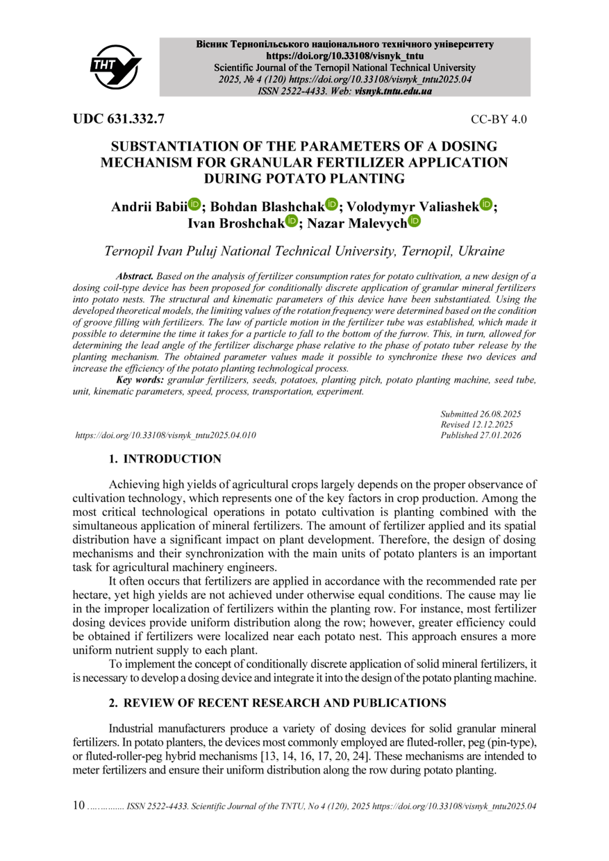 | Bibliographic citation (APA): | Babii, A., Blashchak, B., Valiashek, V., Broshchak, I., & Malevych, N. (2025). Substantiation of the parameters of a dosing mechanism for granular fertilizer application during potato planting. Scientific Journal of the Ternopil National Technical University, 120(4), 10-20. TNTU.. |