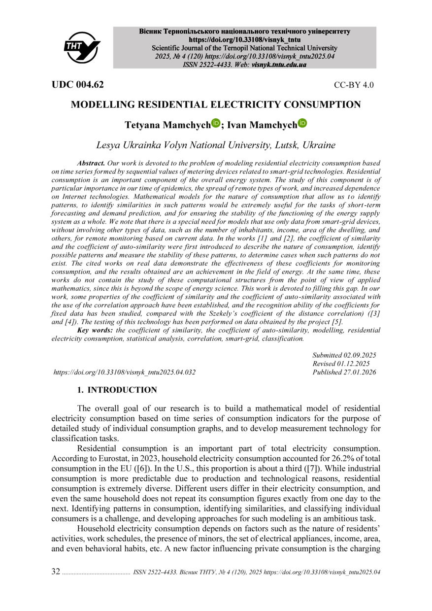 | Bibliographic citation (APA): | Mamchych, T., & Mamchych, I. (2025). Modelling residential electricity consumption. Scientific Journal of the Ternopil National Technical University, 120(4), 32-38. TNTU.. |