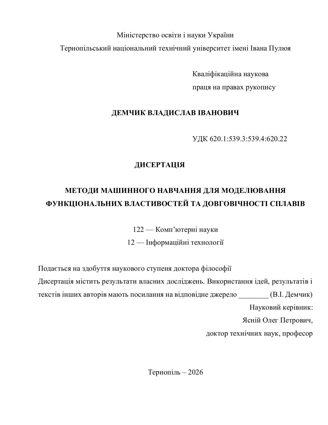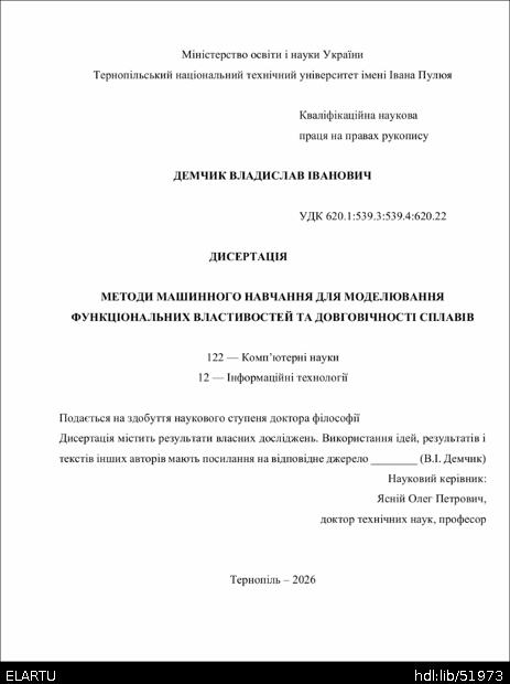 | Бібліографічний опис: | Демчик В. І. Методи машинного навчання для моделювання функціональних властивостей та довговічності сплавів : дис. ... доктора філософії : 122. Тернопіль, 2026. 142 с. |