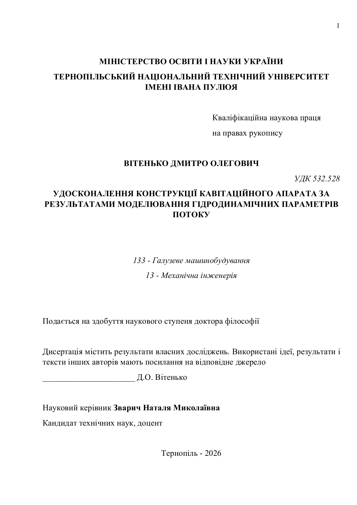 | Перелік літератури: | 1. Abràmoff M. D., Magalhães P. J., Ram S. J. Image processing with ImageJ. Biophotonics international. 2004. Vol. 11, No 7. P. 36-42. 2. Apsley D. Topic T2: Flow in Pipes and Channels. Hydraulics 2. Autumn 2025. URL: https://personalpages.manchester.ac.uk/staff/david.d.apsley/lectures/hydraulics2/t2.pdf (дата звернення: 20.01.2023). 3. Apte D., Ge M., Coutier-Delgosha O. Numerical Investigation of Threedimensional Effects of Cavitating Flow in a Venturi-type Hydrodynamic Cavitation Reactor. ArXiv. 2024. URL: https://arxiv.org/abs/2405.00831 (дата звернення: 28.01.2023). 4. Arya S. S., et al. Non-thermal, energy efficient hydrodynamic cavitation for food processing, process intensification and extraction of natural bioactives: A review. Ultrasonics Sonochemistry. 2023. Vol. 98. 106504. 5. Avdeeva L., Makarenko A., Zhukotsky E. Investigation of the influence of fluid hydrodynamic flow in venturi nozzle on intensity of cavitation. Scientific Works of NUFT. 2019. Vol. 25, Issue 3. P. 145-152. DOI: 10.24263/2225-2924-2019-25-3-18. URL: https://irbis-nbuv.gov.ua/cgibin/ opac/search.exe?C21COM=2&I21DBN=UJRN&IMAGE_FILE_DOWNLOAD=1 &Image_file_name=PDF%2FNpnukht_2019_25_3_18.pdf&P21DBN=UJRN (дата звернення: 06.02.2023). 6. Avdieieva L. Yu, Makarenko A. A., Dekusha H. V. Computer Simulation of Fluid Flow Through a Venturi Nozzle of Different Configurations. Simulation. 2022. 10. P. 13-19. 7. Balin R., Jansen K. E. Direct numerical simulation of a turbulent boundary layer over a bump with strong pressure gradients. Journal of Fluid Mechanics. 2021. 918. A14. 8. Bimestre T. A., et al. Theoretical modeling and experimental validation of hydrodynamic cavitation reactor with a Venturi tube for sugarcane bagasse pretreatment. Bioresource technology. 2020. 311. 123540. 9. Boldman D. R., Neumann H. E. Experimental and analytical study of a conically diffused flow with a nearly separated boundary layer. 1973. 67 p. No. E-7423. 10. Brennen C. E. Cavitation bubble dynamics and noise production. 1993. 11. Brennen C. E. Cavitation and bubble dynamics. Cambridge university press, 2014. 249 p. 89. Yeneneh A. M., Al Balushi K., Jafary T., Al Marshudi A. S. Hydrodynamic Cavitation and Advanced Oxidation for Enhanced Degradation of Persistent Organic Pollutants: A Review. Sustainability. 2024. Vol. 16, No. 11. 4601. 90. You W., Liu T., Manickam S., Wang J., Wang W., Sun X. Cavitation intensity prediction and optimization for a Venturi cavitation reactor using deep learning. Physics of Fluids. 2024. Vol. 36, No. 11. 91. Zeng Q., Zhang A. M., Tan B. H., An H., Ohl C. D. Jetting enhancement from wall-proximal cavitation bubbles by a distant wall. Journal of Fluid Mechanics. 2024. Vol. 987. R2. 104. Вітенько Д. О., Вітенько Т. М. Кавітаційний апарат : пат. 160838, Україна, МПК B01F 23/00, № u202406241; заявл. 27.12.2024 ; опубл. 15.10.2025; Бюл. № 42/2025. 4 с. 92. Zhang G., Shi W., Zhang D., Wang C., Zhou L. A hybrid RANS/LES model for simulating time-dependent cloud cavitating flow around a NACA66 hydrofoil. Science China Technological Sciences. 2016. Vol. 59, No. 8. P. 1252-1264. 93. Zoglopiti E., Roufou S., Psakis G., Okafor E. T., Dasenaki M., Gatt R., Valdramidis V. P. Unravelling the Hydrodynamic Cavitation Potential in Food Processing: Underlying Mechanisms, Crucial Parameters, and Antimicrobial Efficacy. Food Engineering Reviews. 2025. P. 1-42. 94. Zwart P. J., Gerber A. G., Belamri T. A two-phase flow model for predicting cavitation dynamics. Fifth International Conference on Multiphase Flow (May 30 - June 4, 2004). Yokohama, Japan, 2004. 95. Авдєєва Л. Ю., Павлик В. Ю. Дослідження впливу ефектів гідродинамічної кавітації на властивості складних багатокомпонентних систем. Теплофізика та теплоенергетика. 2022. Т. 44, № 2. С. 21-28. DOI: https://doi.org/10.31472/ttpe.2.2022.3 96. Андреєв М. С., Столяренко Г. С. Застосування явища кавітації і кавітаційного реактору для інтенсифікації процесу естерифікації. Вісник Східноукраїнського національного університету імені Володимира Даля. 2025. № 1 (287). С. 57-66. 97. Бабанов І. Г., Гавва О. М., Бабанова О. І., Житнецький І. В., Ястреба С. П. Інноваційне обладнання молокопереробних підприємств : підручник. Київ : ІНКОС, 2019. 718 с. URL: https://dspace.nuft.edu.ua/handle/123456789/29362 (дата звернення: 28.01.2025). 138. Основи тепломасообміну. Василенко С. М., Українець А. І., Олішевський В. В.: підручник / за ред. І. С. Гулого. Київ : НУХТ, 2004. 250 с. ISBN 966-612-030-5. 98. Балабан С. М., Чиж В. М. Основи інженерної графіки : навч. Посіб. Тернопіль : Вид-во ТНТУ ім. Івана Пулюя, 2012. 167 с. URL: https://elartu.tntu.edu.ua/bitstream/lib/20683/1/osnovy_inzhenernoyi_hrafiky.pdf. (дата звернення: 06.10.2024). 99. Берник І. М. Дослідження параметрів кавітаційного процесу обробки технологічних середовищ. Техніка будівництва. 2014. № 32. С. 14-18. 100. Берник І. М., Луговський О. Ф. Встановлення основних параметрів впливу технологічного середовища на робочий процес ультразвукової кавітаційної о