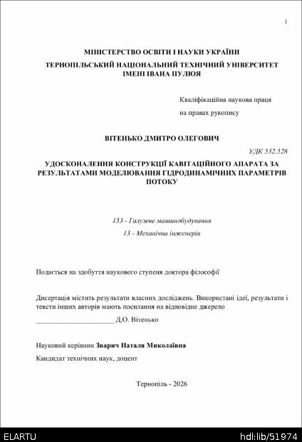 | Бібліографічний опис: | Вітенько Д. О. Удосконалення конструкції кавітаційного апарата за результатами моделювання гідродинамічних параметрів потоку : дис. ... доктора філософії : 133. Тернопіль, 2026. 233 с. |