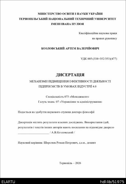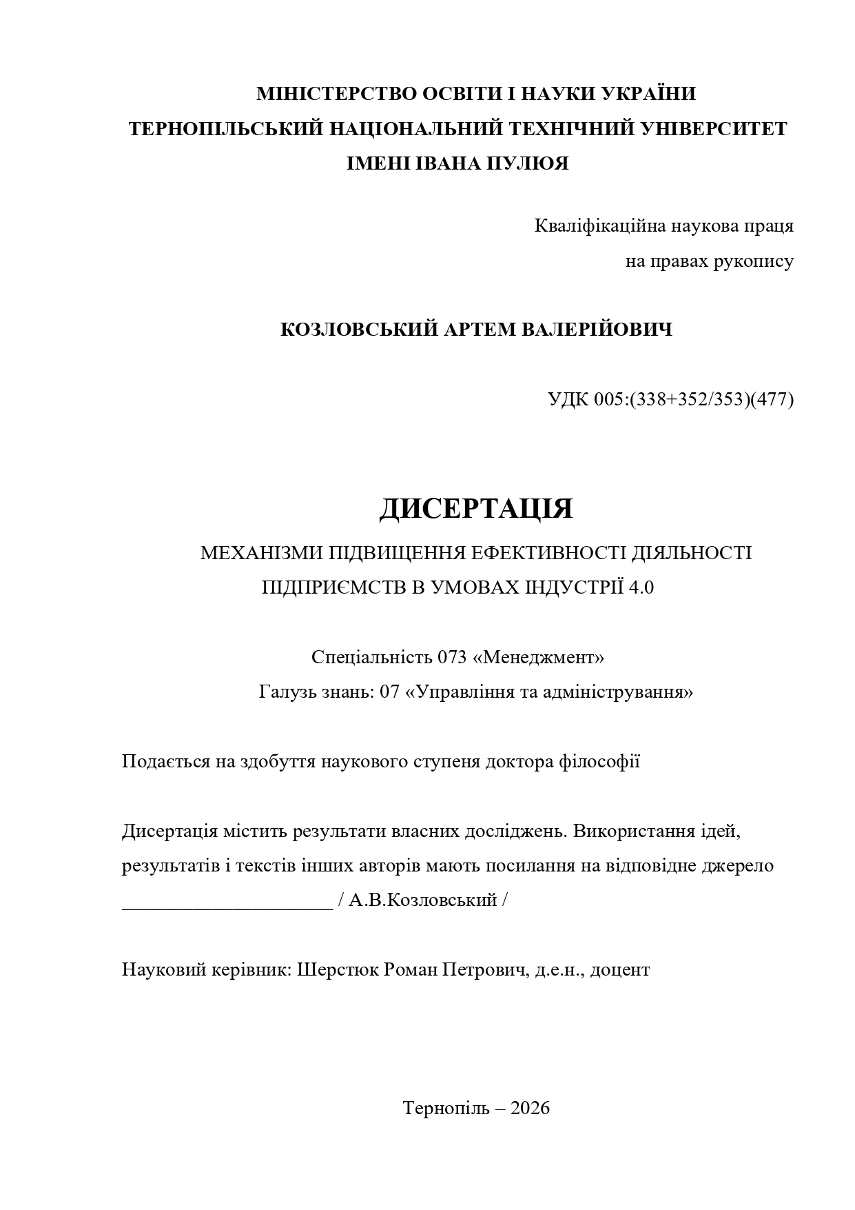 середовища та обмежених ресурсів. Kozlovsky A.V. Mechanisms for enhancing enterprise performance in the context of Industry 4.0 – Qualification scientific work in the form of a manuscript. Dissertation for the degree of Doctor of Philosophy in the specialty 073 «Management». Ternopil National Technical University named after I. Pulyuy, Ministry of Education and Science of Ukraine, Ternopil, 2026. The dissertation is devoted to solving the current scientific and practical problem of increasing the efficiency of enterprises in the conditions of the development of Industry 4.0, which involves the comprehensive implementation of digital technologies in the production and economic, managerial and strategic activities of business entities, taking into account dynamic changes in the operating environment caused by both internal factors and global transformation processes, in particular digitalization, geopolitical risks, military actions and instability of the national economy. The dissertation research consists of an introduction, three sections of the main part, conclusions, a list of sources used and appendices. The first section, «Theoretical Foundations for Determining the Efficiency of an Enterprise in the Conditions of Industry 4.0», provides an in-depth analysis of the genesis of scientific approaches to interpreting the category of «enterprise efficiency» and proves that in the conditions of the digital economy it acquires a systemic, multi-criteria and dynamic nature. The evolution of views from the classical understanding of efficiency as the ratio of «results-costs» and profit maximization to modern approaches that take into account resource productivity, added value creation, innovation, business model sustainability, and the ability of an enterprise to continuously adapt under the influence of technological, market and institutional changes is shown. It is emphasized that in the Industry 4.0 paradigm, efficiency is not reduced to financial results, but reflects the integrated effect of the digitalization of business processes, management decisions and organizational transformation. The paper argues that modern enterprise efficiency is formed within the framework of interrelated components: economic, social, environmental and operational. Economic efficiency is revealed as the ability to ensure financial performance, competitive advantages and returns on investments in digital solutions (increased productivity, marginality, capital turnover, cash flow stability). Social efficiency is characterized by improving the quality of employment, developing digital competencies of personnel, safe working conditions, increasing employee involvement and forming a digital corporate culture, which is a prerequisite for the effective implementation of changes. Environmental efficiency is considered as the ability of an enterprise to minimize negative impact on the environment by using digital technologies for monitoring and optimizing resource consumption (energy, water, materials), increasing the transparency of environmental indicators and transitioning to the principles of a circular economy. Operational efficiency is detailed as achieving high parameters of quality, speed and reliability of processes based on automation, digital control, data analytics and standardization of management procedures. It has been established that in the Industry 4.0 environment, there is a shift in emphasis from «the effectiveness of individual functions» to the effectiveness of end-to-end business processes and digital ecosystems (suppliers – production – logistics – sales – customer). In this regard, the section has classified types of efficiency according to a number of characteristics: by management level (operational, tactical, strategic), by time horizon (short, medium and long-term), by sources of result formation (resource, innovative, managerial, digital), by the degree of technology integration (traditional, partially digitalized, digitally mature), as well as by the nature of measurement (quantitative, qualitative, integral). It has been proven that such a classification creates a methodological basis for building a system of indicators that allows comparing enterprises by the level of digital transformation and tracking the dynamics of the effectiveness of management decisions. Particular attention is paid to identifying the key characteristics of an effective digitalized business process, which include: customer-centricity and focus on value creation; transparency and data-driven process management; integration of information flows between departments and external counterparties; flexibility and speed of process reconfiguration in accordance with changes in demand and risks; automation of routine operations; use of predictive analytics to predict results and prevent deviations; cyber resilience and reliability of digital infrastructure; as well as measurability of results through KPIs that reflect economic, social, environmental and operational effects. The generalization of theoretical provisions allowed us to formulate the author's definition of the effectiveness of an enterprise in the context of digital transformation as the ability to achieve strategic and operational goals by integrating Industry 4.0 technologies and tools (artificial intelligence, Internet of Things (IoT), big data (Big Data), automation, robotics, blockchain) into business processes and the management system, while ensuring increased productivity, adaptability, sustainability and competitiveness of the enterprise based on data-driven decision-making and continuous innovation. This definition emphasizes the complexity of efficiency, its orientation not only to the result «here and now», but also to the long-term ability of the enterprise to develop in the context of technological and market changes. In the second section, «Practical Aspects of Researching Enterprise Efficienc
