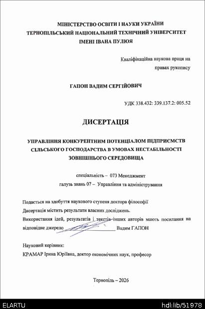 | Bibliographic description (Ukraine): | Гапон В.С. Управління конкурентним потенціалом підприємств сільського господарства в умовах нестабільності зовнішнього середовища : дис. ... доктора філософії : 073. Тернопіль, 2026. 248 с. |